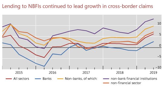 Se torniamo alle statistiche Bis, qui osserviamo che l’espansione del credito al settore non bancario – 190 miliardi nel secondo quarto del 2019 – ha pesato “oltre la metà dell’incremento trimestrale dei crediti transfrontalieri”, ed è stato in gran parte guidato “dal credito verso le istituzioni finanziarie non bancarie, aumentato di 172 miliardi”. E’ inoltre interessante sapere che “la maggior parte di questi nuovi prestiti si è diretta verso pochi centri finanziari come le Isole Cayman (37 miliardi di dollari), il Regno Unito (34 miliardi) e il Lussemburgo (24 miliardi)”.
