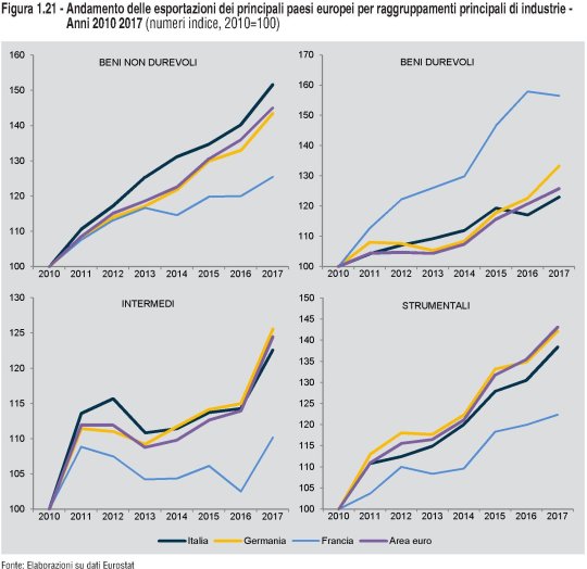 Il dato aggregato però ci dice poco sulla qualità di questo export. Per addentrarci un po’ di più, dobbiamo segmentare i beni esportati nelle diverse categorie. Scopriamo così che l’Italia è andata molto bene, nel confronto con gli altri partner europei, nei beni di consumo non durevoli (+51,6% fra il 2010 e il 2017). La Germania si è segnalata invece per i buoni andamenti di beni intermedi (+25,7%) e strumentali (+43,1%), mentre la Francia è andata molto bene sui beni di consumo durevoli (+56,5%). L’Italia comunque è andata mediamente bene anche nell’export di beni intermedi, ossia di beni legati ai processi produttivi. Un segnale di quanto il nostro paese sia inserito nella catene globali del valore.