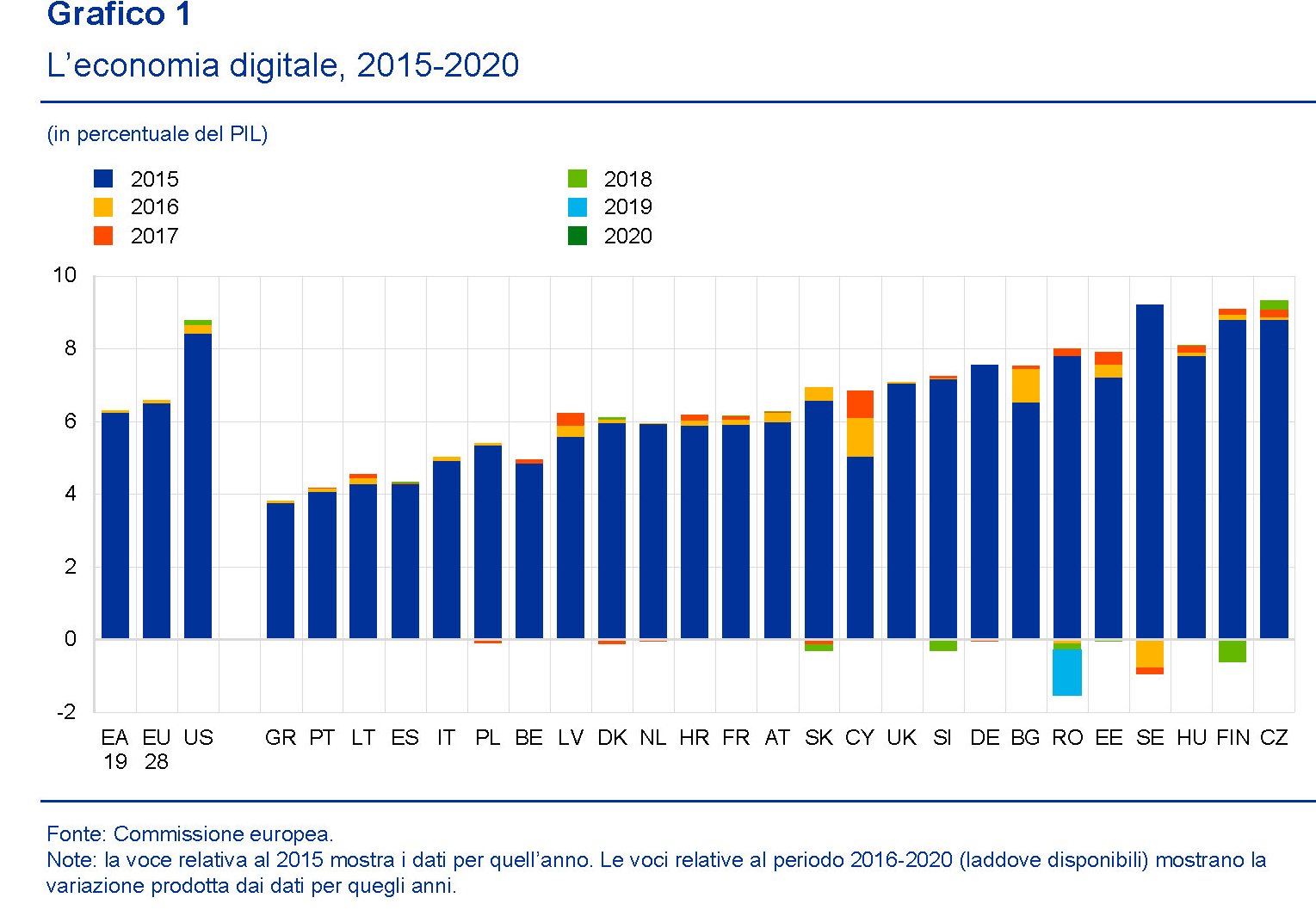 E anche le ricognizioni sul contributo dell’economia digitale alla crescita dell’occupazione lo confermano: “Le economie con un’incidenza più elevata di economia digitale sul valore aggiunto totale tendono a essere quelle con tassi di disoccupazione più bassi”, scrive la Bce.