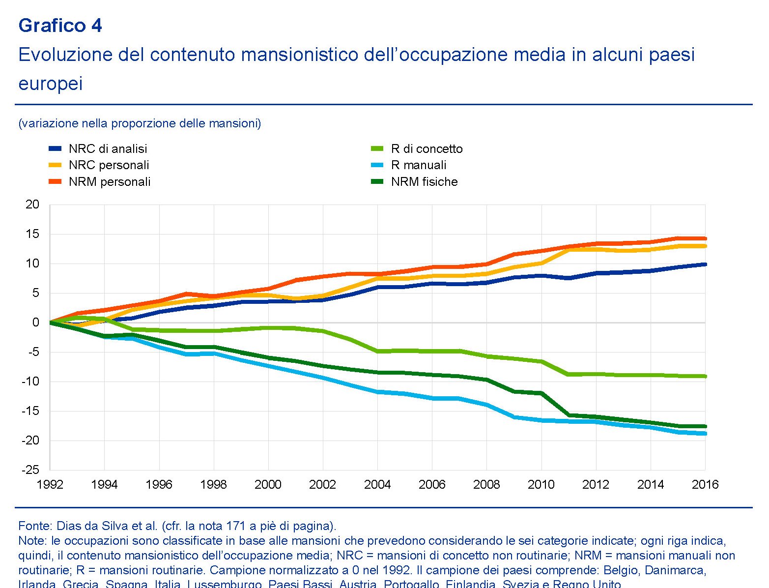 Che l’Europa sia in grado di fare questo salto culturale è tutto da vedere. Non è certo un caso che l’hi tech sia nato e si sia sviluppato negli Usa. Di sicuro l’evoluzione del mercato del lavoro, che sembra premiare i soggetti che hanno a che con lavori complessi (grafico sotto), fa capire che il gioco vale la candela.