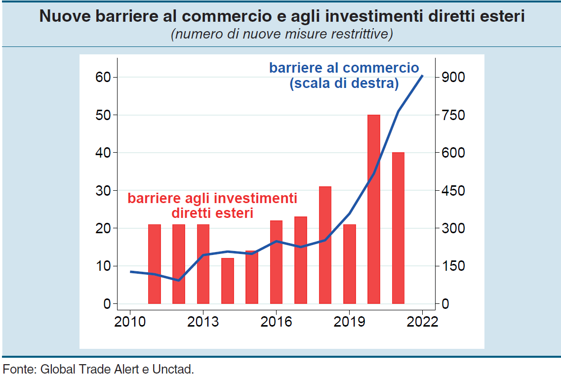 Le ultime considerazioni finali del governatore Visco, da questo punto di vista, sono una lettura assai istruttiva. L’analisi del contesto internazionale, che non è buono per i noti motivi, conduce alla conclusione che “l’emergere di fratture nelle relazioni internazionali può avere effetti duraturi, influenzando le strategie aziendali di lungo periodo, incluse quelle di localizzazione delle produzioni”. Una tendenza che si rispecchia nell’aumento significativo delle restrizioni al commercio che ha caratterizzato gli ultimi anni (grafico sopra).