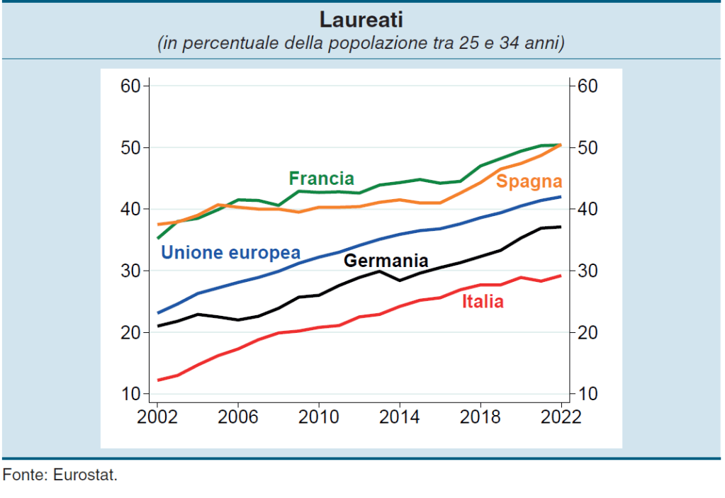 Traduco per chi non ama le figure: l’Italia si caratterizza per un livello ancora carente di lavoratori con istruzione superiore e per giunta con la prospettiva di veder diminuire la sua forza lavoro a causa dell’invecchiamento della popolazione. Messe insieme, le due cose – e tralasciamo per amor di patria le conseguenze sul welfare – non dicono nulla di buono per il nostro futuro economico.