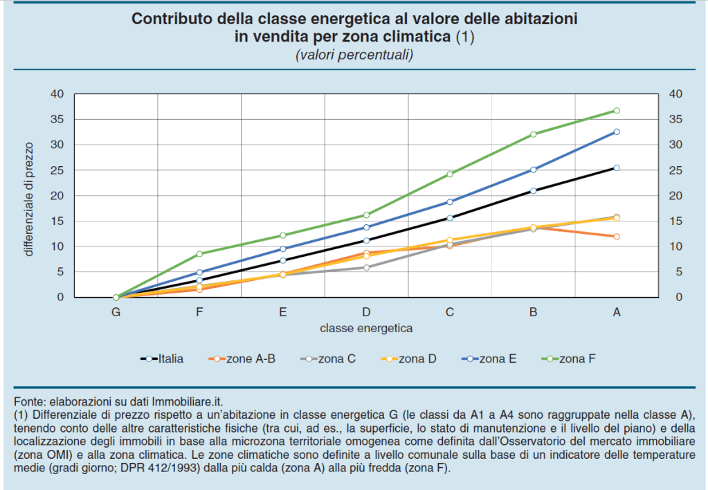 Se guardiamo oltre la congiuntura, che comunque rimane avversa, ci sono altre ragioni che complicano le prospettive per la ricchezza immobiliare degli italiani. La normativa europea per l’efficientamento energetico delle abitazioni, infatti, solleva parecchi interrogativi sulle quotazioni prossime venture di molta parte dello stock immobiliare italiano, del quale solo il 12 per cento risulta avere una classe energetica efficiente, quindi fra il livello A1 e A4. La gran parte, il 53%, si colloca nelle classi più basse (G ed F) e questo genera un differenziale nelle quotazioni di prezzi fra le categorie migliori e quelle peggiori che può arrivare al 25% nella media nazionale.