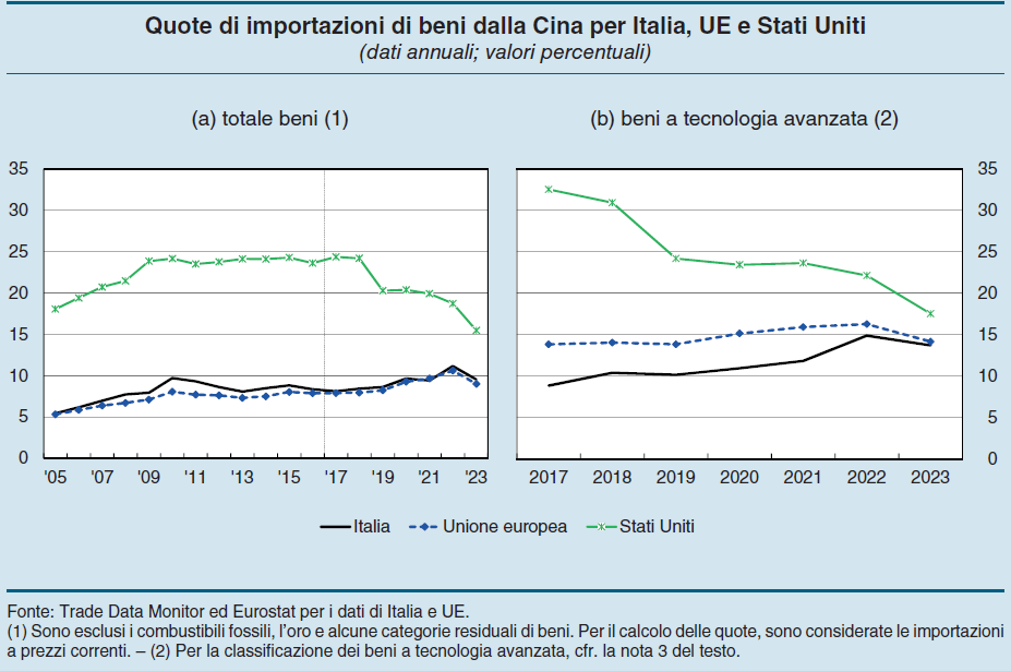 Un paio di esempi basteranno. Gli Usa hanno diminuito drasticamente le importazioni dalla Cina – oltre 5 punti percentuali – ma l’hanno aumentata dai paesi vicini come Taiwan, Vietnam e India, dove magari sono state spostate nel frattempo alcune catene di produzione, magari proprio a marchio cinese. L’Europa ha visto diminuire meno degli Usa le importazioni di merci cinesi, fra 1 e 2 punti percentuali, ma si sono verificate curiose triangolazioni come quella osservata fra Cina, Olanda e Italia.