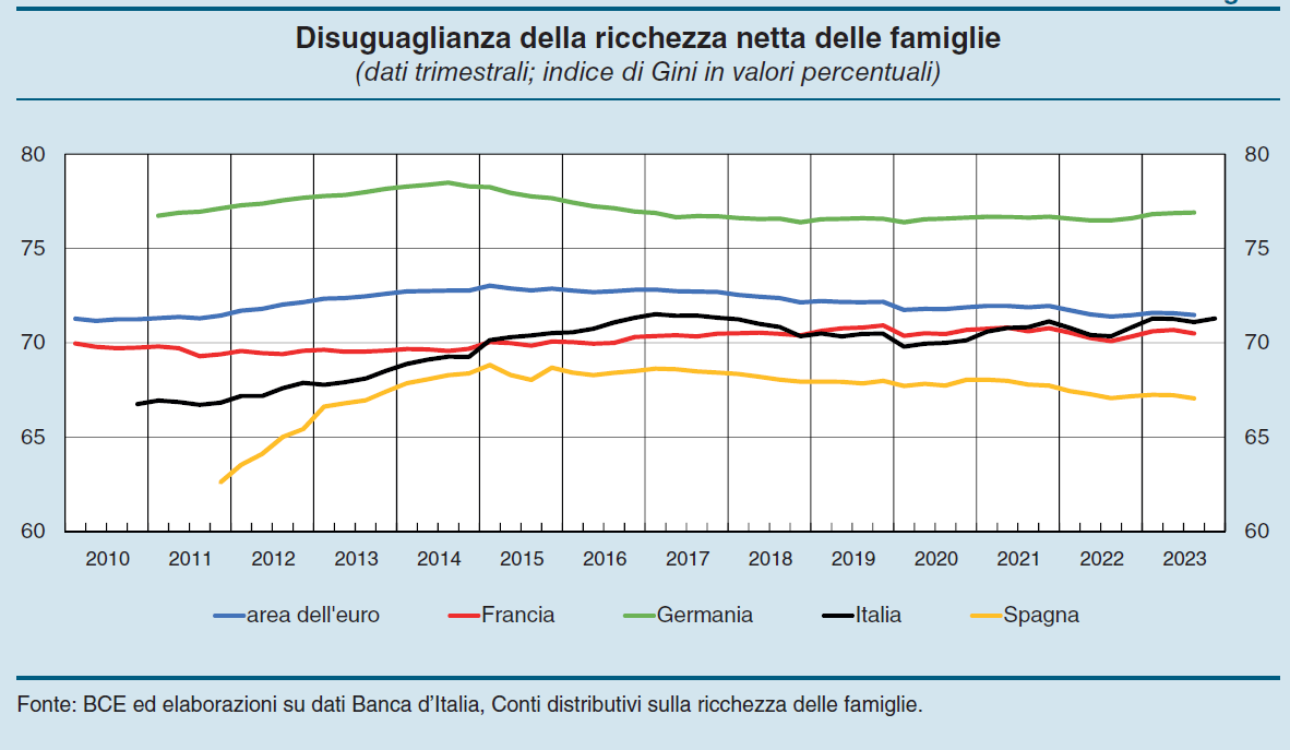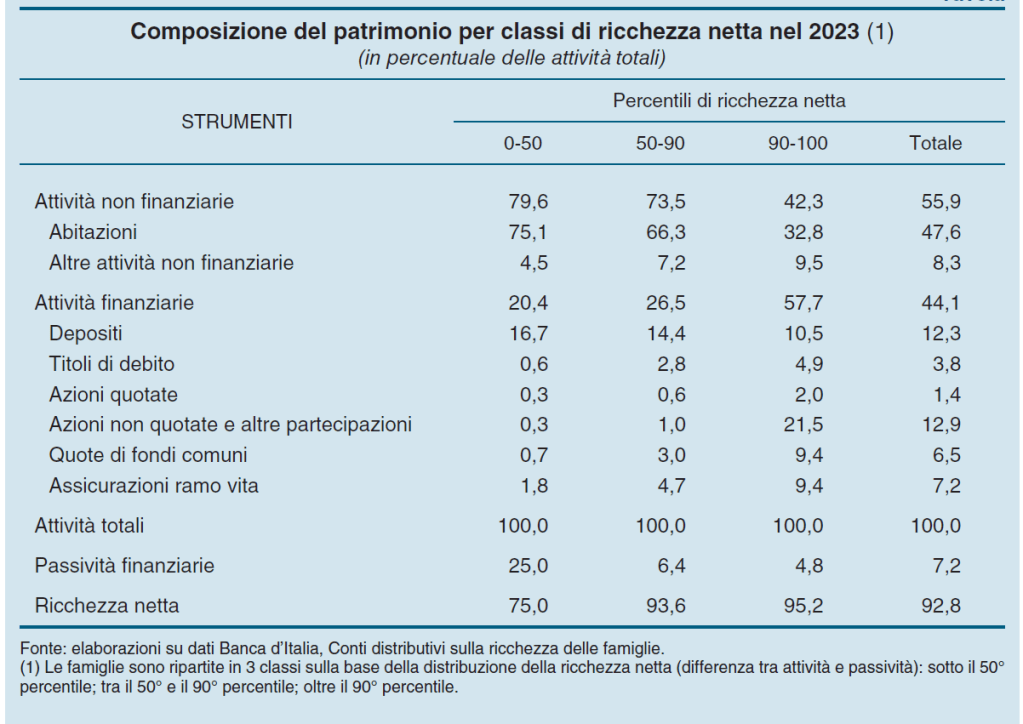 Un altro elemento interessante da osservare è che l’aumento della ricchezza netta complessiva, che a prezzi correnti, sempre fra il 2010 e il 2023, è stato del 14% è stato guidato dalla crescita del 29% della ricchezza delle famiglie più abbienti, che hanno goduto il premio derivante dall’aver investito in asset più rischiosi, mentre i ceti mediani, chiamiamoli cosi, hanno visto dimagrire la loro ricchezza a causa della perdita di valore del mattone, che gli attivi finanziari non solo riusciti a compensare. Probabilmente perché non sono capienti abbastanza.