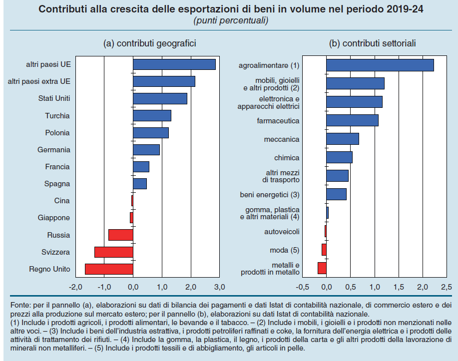 Il grosso del contributo alla crescita è arrivato dall’agroalimentare, dagli “altri manufatti”, in gran parte gioielli, dall’elettronica e dalla farmaceutica. Calano invece le esportazioni di metallurgia, che ha pagato il prezzo dei pesanti rincari energetici seguiti alla guerra, e moda.