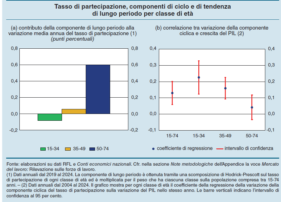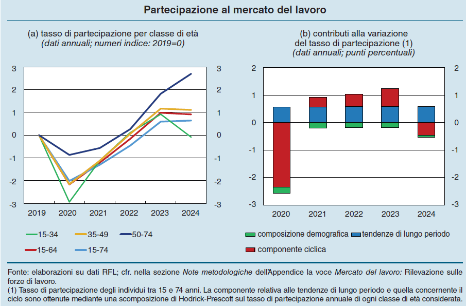 Il primo dato che dobbiamo osservare è quasi scontato: dopo la pandemia, quando era praticamente crollata, la partecipazione al lavoro in Italia è cresciuta rapidamente. Per tutta la popolazione in età lavorativa, quindi i 15-74enni, il tasso di attività, nel 2023, risultava maggiore dello 0,6% rispetto a quello del 2019, arrivando persino a 0,9% nella fascia 15-64enni. Nel 2024, tuttavia, questa crescita si è interrotta, per lo più a causa di fattori ciclici (grafico in altro a destra).