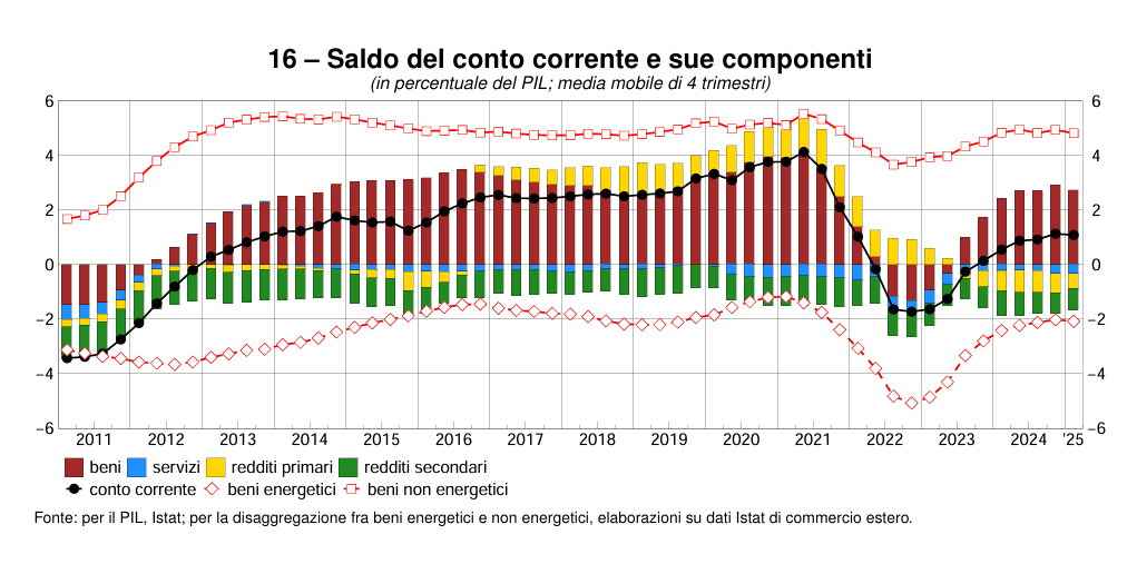 I dati del saldo corrente mostrano con chiarezza che ormai i nostri attivi dipendono esclusivamente dal conto delle merci, che quindi è necessario mantenere per conservare l’equilibrio dei nostri conti esteri. Finora ci siamo riusciti, anche se con qualche difficoltà e al prezzo di cambiamenti sostanziali dei nostri sistemi produttivi. Ma il futuro è denso di incognite. Non ci sono solo i dazi americani che preoccupano gli osservatori, ma anche la crescente insidiosità della concorrenza, specie quella cinese, che sta aumentando il suo potere i penetrazione anche nei settori a maggiore qualità.