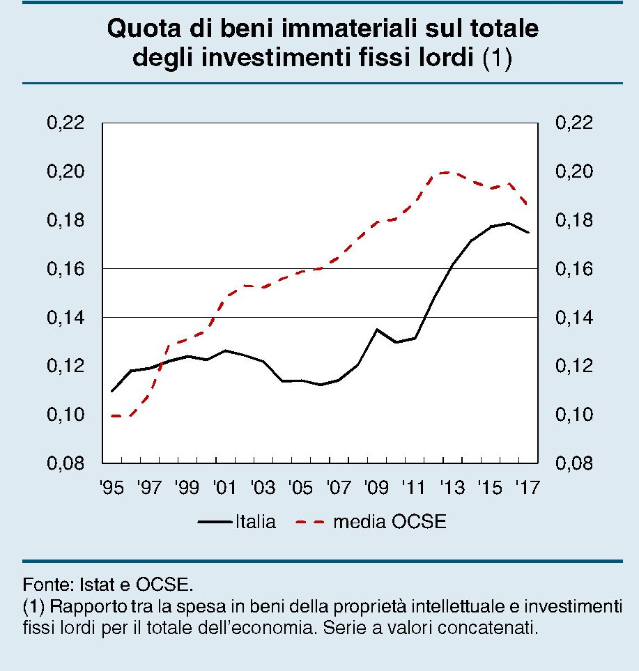 Partiamo da una premessa. “Nella media dei paesi Ocse – scrive la Banca – l’incidenza delle spese in ricerca e sviluppo, software e altri prodotti della proprietà intellettuale sul totale degli investimenti è quasi raddoppiata negli ultimi vent’anni, fino a raggiungere il 20 per cento, sostenendo l’innovazione tecnologica e la crescita”.