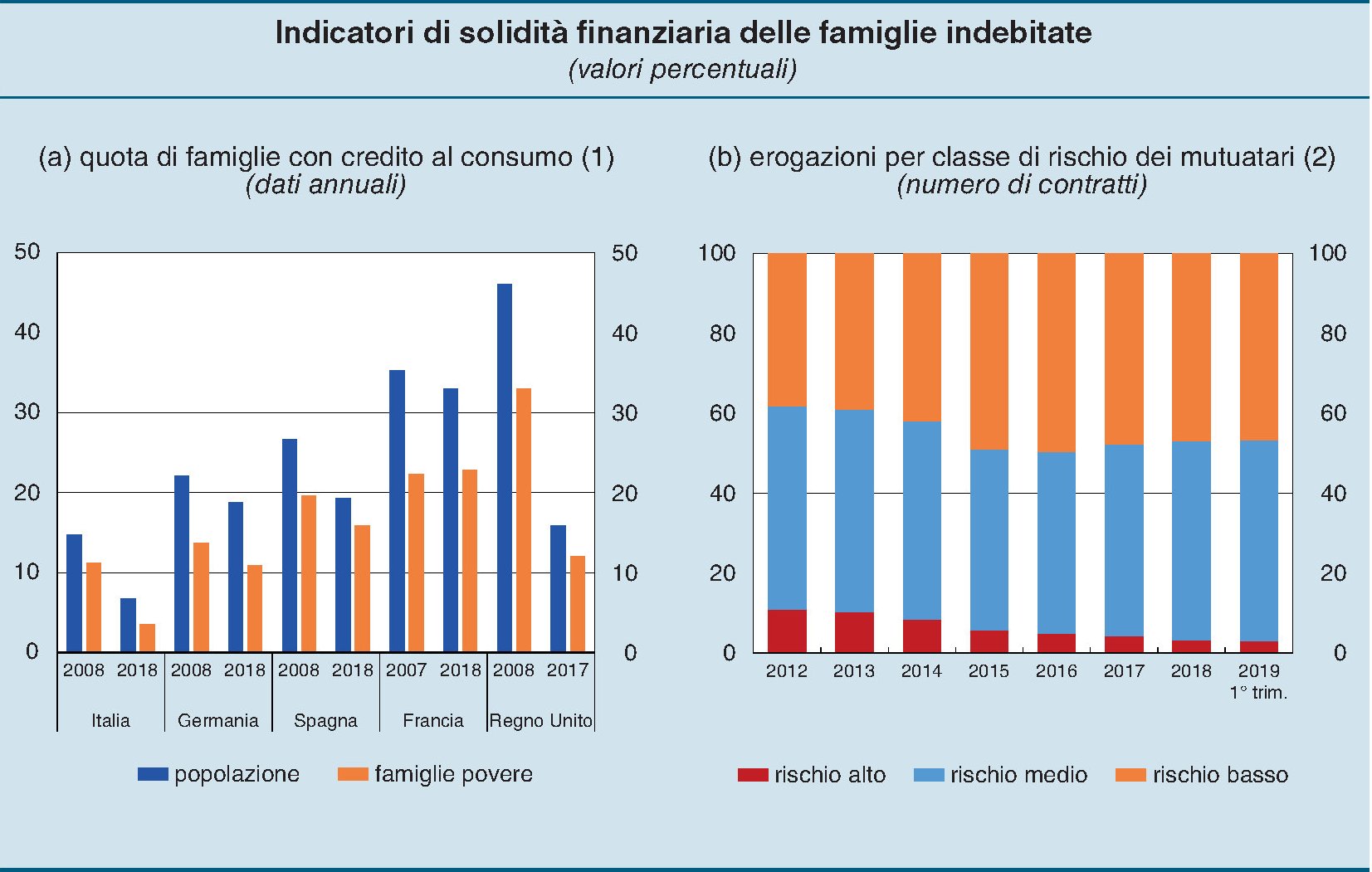 L’altra voce che fa crescere i debiti, ossia il credito al consumo, è in crescita dell’8,6%, proseguendo un’altra tendenza che va avanti dal 2015. Nel 2019 “l’incidenza di questi debiti sul reddito disponibile è stata superiore in Italia rispetto alla media dell’area (12,9 e 10,5 per cento da 9,2 e 11,4 nel 2007, rispettivamente). Ma vale la pena sottolineare che “la quota di questi finanziamenti riferita alle famiglie con reddito basso è diminuita”. Sono insomma le famiglie più ricche a far ricorso a queste pratiche.