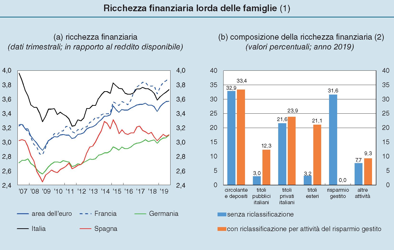 Oggi non è più così. Il mattone gioca sempre un ruolo importante nei bilanci familiari, ovviamente, ma è la finanza a regalare qualche soddisfazione. Nel 2019, infatti, la ricchezza finanziaria è cresciuta del 5,2% grazie al rialzo dei titoli, portando le attività finanziarie al 42% della ricchezza totale lorda, per un valore medio pari a 3,7 volte il reddito disponibile. Un valore elevato, rispetto al confronto con i nostri partner europei, ma molto inferiore a quanto fosse nel 2007, ossia prima delle grande crisi finanziaria e quella dell’euro.