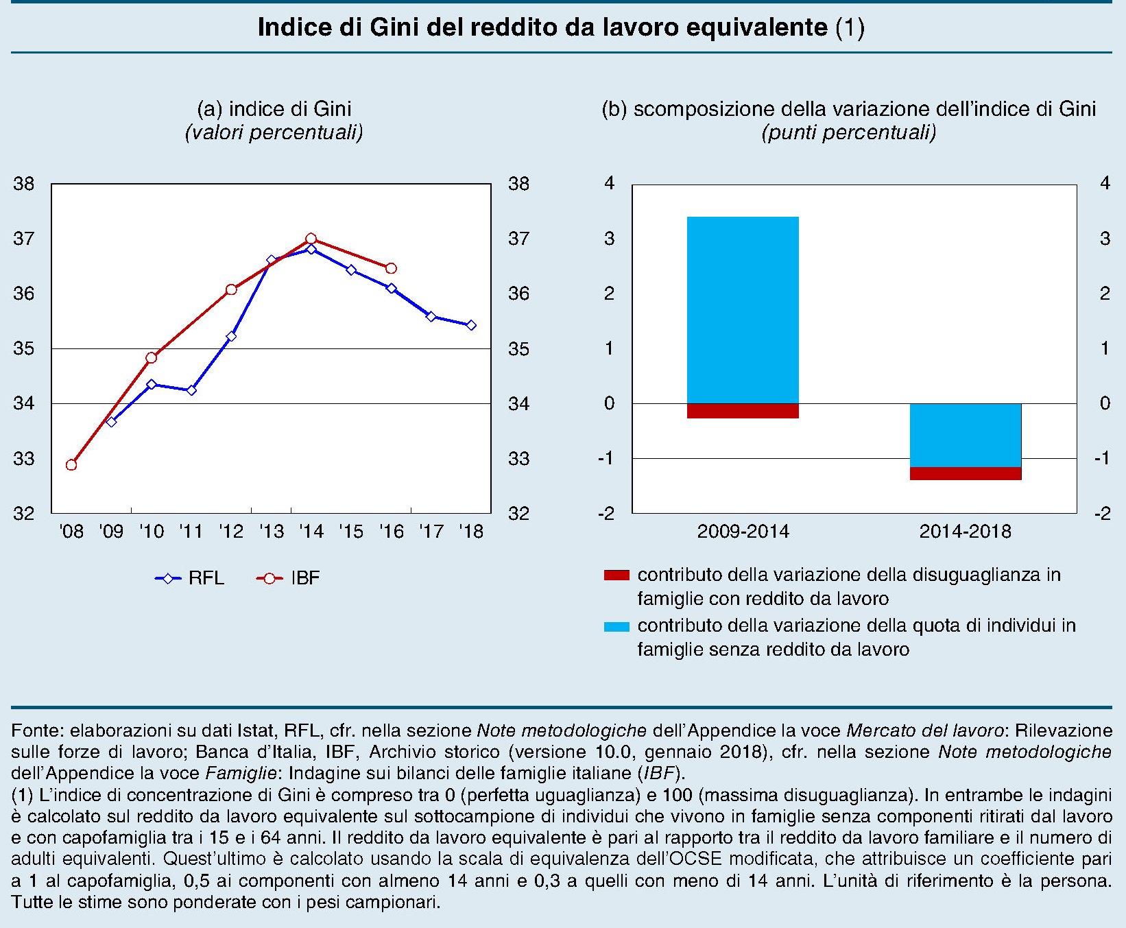 Fatte queste premesse, è utile sapere che “tra gli individui che vivono in nuclei con a capo una persona tra i 15 e i 64 anni e senza componenti in pensione la disuguaglianza del reddito da lavoro equivalente è significativamente aumentata nel periodo 2009-2014: l’indice di Gini è salito dal 33,7 al 36,8 per cento”. Detto altrimenti l’aumento della diseguaglianza si è concentrato fra chi lavora. O, per meglio dire, fra quelli che non lavorano pur essendo in età lavorativa.