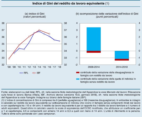 Dopo il 2014 si è registrata una lieve riduzione dell’indicatore di diseguaglianza, arrivata al 35,4 nel 2018. La qualcosa “è riconducibile all’aumento delle posizioni lavorative”. Ciò in quanto “gli individui in famiglie senza occupati sono scesi al 10 per cento delle popolazione di riferimento dall’11,2 per cento nel 2014”. Al contempo c’è stata una certa crescita del reddito da lavoro “nei quinti più bassi della distribuzione”, come nota sempre Bankitalia.