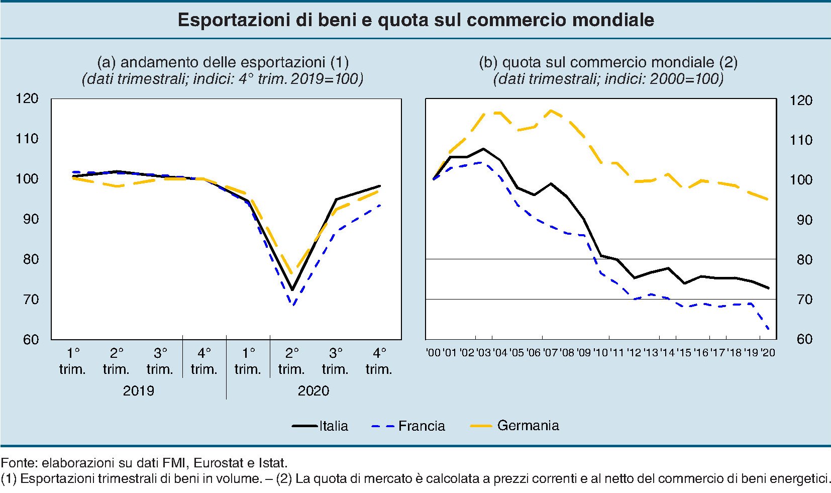 In questo quadro diventa interessante osservare il comportamento dell’interscambio italiano che, pur avendo subito una forte contrazione, ha avuto un comportamento molto diverso da quello osservato durante la crisi finanziaria del 2008. A differenza di allora, infatti, “la quota dell’Italia sul commercio mondiale di beni è rimasta pressoché invariata, riflettendo l’accresciuta capacità competitiva delle nostre imprese esportatrici”.