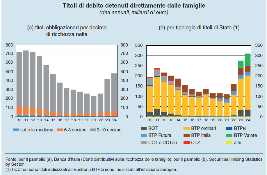 La storia cambia dopo il 2022. Nell’ultimo triennio, infatti, le famiglie hanno ricominciato a comprare obbligazioni pubbliche e private: 262 miliardi complessivamente dei quali 196 investiti in debito pubblico italiano. La salita dei tassi di interesse ha fatto tornare rapidamente molte persone alle vecchie abitudini, confermando che per molti il risparmio gestito non è una soluzione soddisfacente. Anche qui, circa il tre quarti delle obbligazioni detenute dalle famiglie si concentra nelle mani felle famiglie più abbienti.