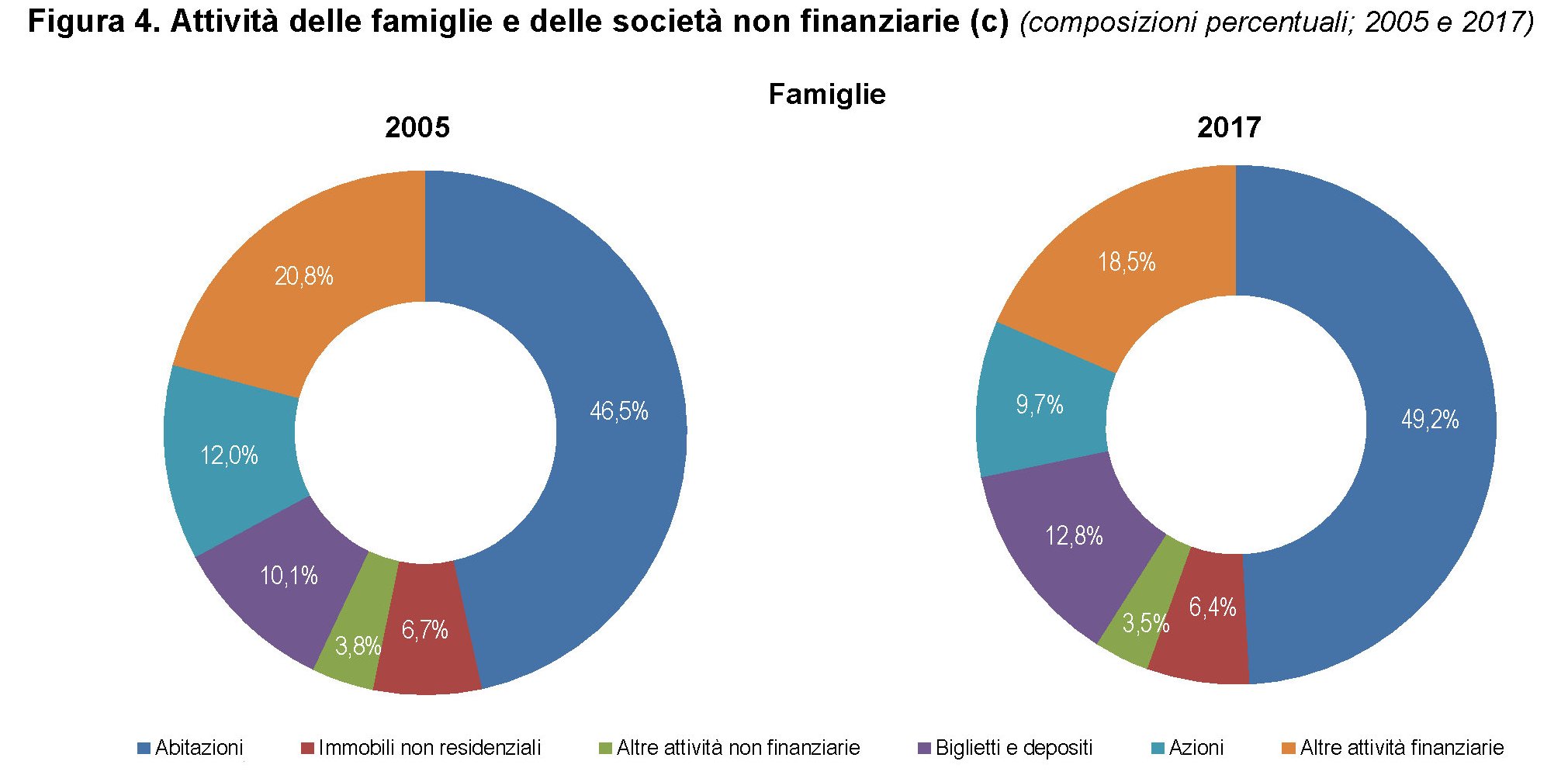Nel 2011, infatti, le abitazioni quotavano 5.687 miliardi di euro che nel 2017 sono diventati 5.246. Ciò ha avuto un impatto non da poco nella composizione del portafogli delle famiglie, anche se la quota della ricchezza non finanziaria rispetto a quella finanziaria risulta ancora più elevata rispetto al 2005. Dal che si potrebbe dedurre che lo sboom si è “mangiato” gran parte dell’aumento dei prezzi intercorso da allora, ma non tutto. Quanto alla ricchezza finanziaria, è interessante osservare che è cresciuta la quota dei depositi rispetto agli altri attivi.