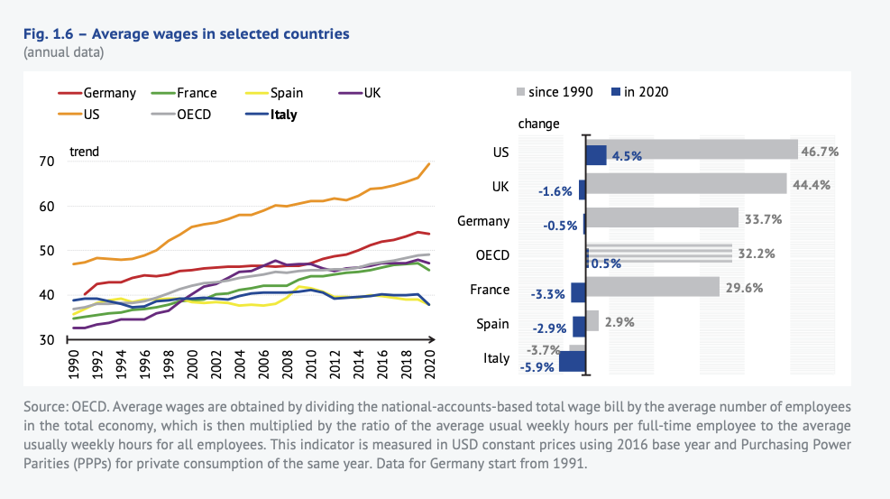 Queste tendenze si inseriscono all’interno di un andamento del reddito tutto sommato soddisfacente, visto che la pandemia ha aumentato la quota del risparmio, pure se al tempo stesso ha fatto crescere la fragilità finanziaria. Nel 2021 il nostro paese ha visto crescere il reddito, dopo il brusco calo sofferto nel 2020, ma rimane sempre fanalino di coda in Europa per aumento complessivo negli ultimi anni: dal 1990 siamo gli unici fa i grandi paesi ad avere avuto una dinamica negativa dei redditi. L’italiano medio ha perso il 3,7%, l’americano medio ha guadagnato il 46,7%.