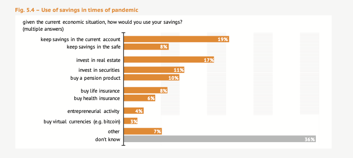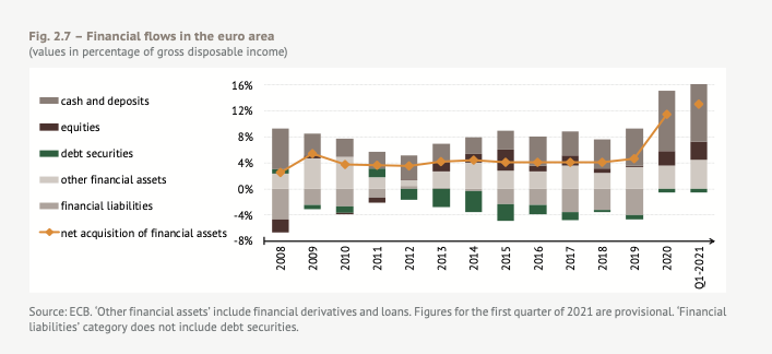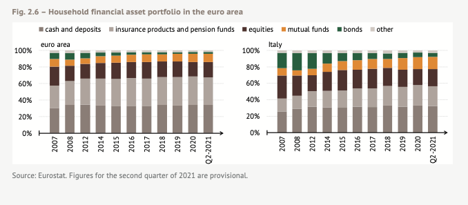 Il grafico sopra ci comunica un’altra informazione interessante. All’aumento delle posizioni liquide ha corrisposto un sostanziale calo degli acquisti obbligazionari, “vittime” probabili dell’ambiente finanziario a tassi praticamente azzerati, mentre si è osservata una certa crescita dell’azionario, dei fondi e dei prodotti assicurativi. L’età dei tassi bassi, insomma, se da un lato ha spinto molte persone a rimanere liquide, ha anche alimentato una certa richiesta di rendimento, che ha trovato soddisfazione negli investimenti più rischiosi.