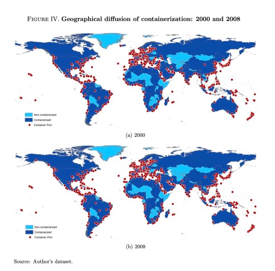 La fioritura di pallini rossi, che nella legenda proposta dal paper rappresentano i porti che ospitano container racconta tutto quello che c’è da sapere. A patto però di intendersi sul significato di containerizzazione, così come definito nello studio. In particolare il termine porta con sé la diffusione di un complesso intermodale che include i mezzi di trasporto – camion, treni, navi da trasporto di container, macchinari speciali, come le gru di sollevamento e i magazzini dove vengono depositate ogni giorno milioni di tonnellate di merci che viaggiano lungo il pianeta seguendo in larghissima parte le rotte marittime.