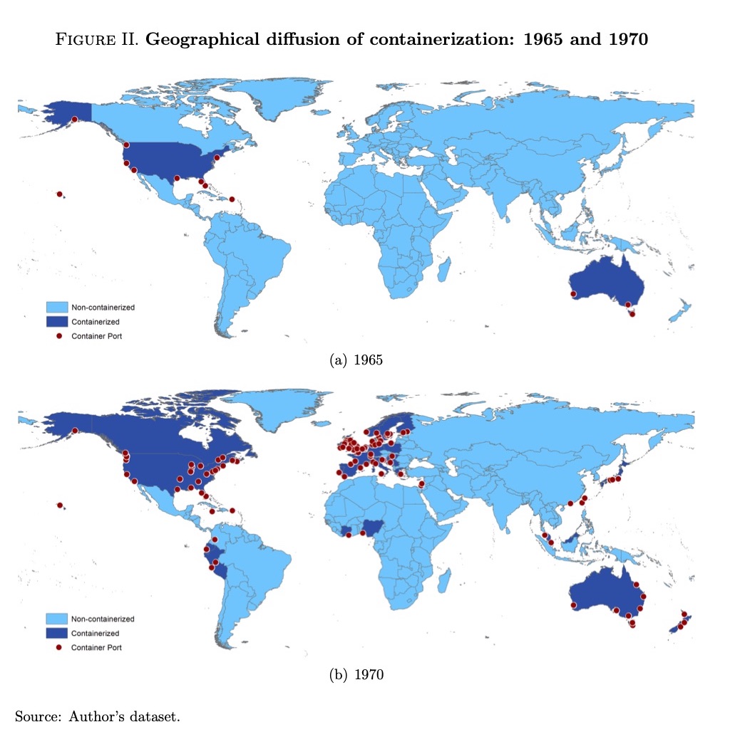 La fioritura di pallini rossi, che nella legenda proposta dal paper rappresentano i porti che ospitano container racconta tutto quello che c’è da sapere. A patto però di intendersi sul significato di containerizzazione, così come definito nello studio. In particolare il termine porta con sé la diffusione di un complesso intermodale che include i mezzi di trasporto – camion, treni, navi da trasporto di container, macchinari speciali, come le gru di sollevamento e i magazzini dove vengono depositate ogni giorno milioni di tonnellate di merci che viaggiano lungo il pianeta seguendo in larghissima parte le rotte marittime.