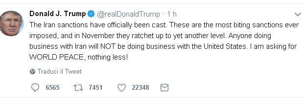 Tutto ciò mentre il ministro degli esteri nordcoreano va in visita in Iran per due giorni e la Russia si dice delusa dalle sanzioni Usa. Che fine farà il nostro giro d’affari con l’Iran? Ah saperlo, finirà nel mare grosso del nascente sovranismo socialista italiano, che proprio oggi festeggia il suo decreto Dignità, ormai approvato. Ora bisogna nazionalizzare Alitalia, l’Ilva e anche il nostro debito estero, così finalmente il cattivissimo spread non farà più danni. Almeno il primo anno. E dopo?