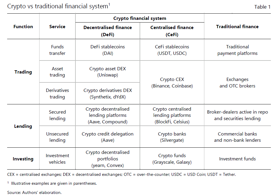 La tabella sopra riepiloga le attività delle DeFi in confronto con le CeFi (centralised finance), ossia gli intermediari tradizionali. In sostanza, la DeFi promette di fare le stesse cose, ma senza interventi di mediatori, in puro spirito internet. Che vuol dire che le prime registrano tutte tramite blockchain, mentre le seconde nei loro archivi. Trasparenza, insomma, pure se in codice, versus segreto d’ufficio.