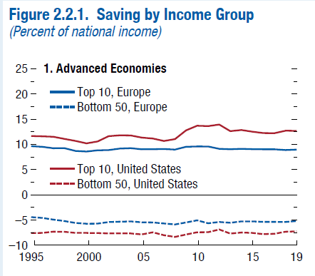 Il Fondo tuttavia sottolinea che “le famiglie ricche intorno al mondo possono essere state importanti contributori dell’eccesso di risparmio”, e poiché “una voluminosa letteratura” individua in questo eccesso uno dei driver del ribasso del tasso naturale di interesse, le due cose possono essersi combinate, con l’aggravante di un crescente eccesso di risparmio dei paesi emergenti esportatori che si è aggiunto a quello dei ricchi cospirando contro il povero tasso naturale.
