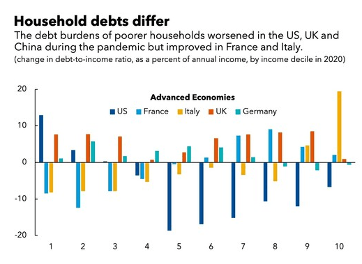 Il grafico sopra è riferito solo alle economia avanzate, ma ci comunica già diverse informazioni. La prima che vale la pena sottolineare è quella relativa all’aumento dei debiti nella fascia più povera della popolazione, che si osserva per Usa (oltre il 10%), UK e moderatamente in Germania, mentre risulta essere diminuita in Francia e Italia.