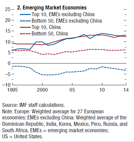Quindi se aumento di diseguaglianza c’è stato, almeno nella capacità di risparmio, deve essere intervenuto nelle fasce centrali. Nelle economie emergenti invece si osserva con chiarezza un aumento dei risparmi nei top 10, ma al tempo stesso (almeno in Cina) un andamento stabile del risparmio dei bottom 50. Insomma: non è molto agevole trarre conclusioni da queste osservazioni. Tantomeno slogan.