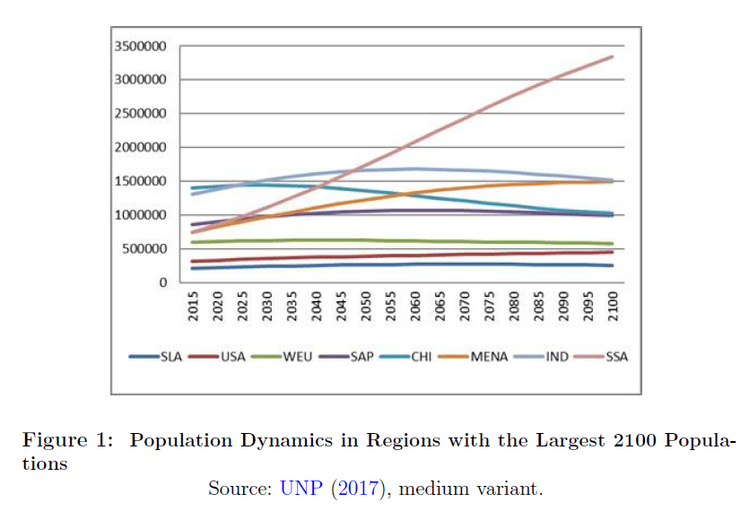 Se l’economia fosse fisica, sarebbe difficile se non impossibile sfuggire al peso gravitazionale della demografia. Se l’economia fosse fisica, perciò, il pregevole lavoro di ricerca pubblicato dal NBER che si interroga sui futuri poteri globali dovrebbe fatalmente concludersi con la fondata previsione che il peso della massa africana, non più solo territoriale ma ormai anche demografico, sarà l’evento che condurrà l’umanità, ormai nel secolo XXII, all’alba del secolo africano. Il grafico sopra, infatti, ci racconta che l’Africa Sub Sahariana (SSA, ndr) sarà l’unica che conoscerà una crescita significativa della popolazione.