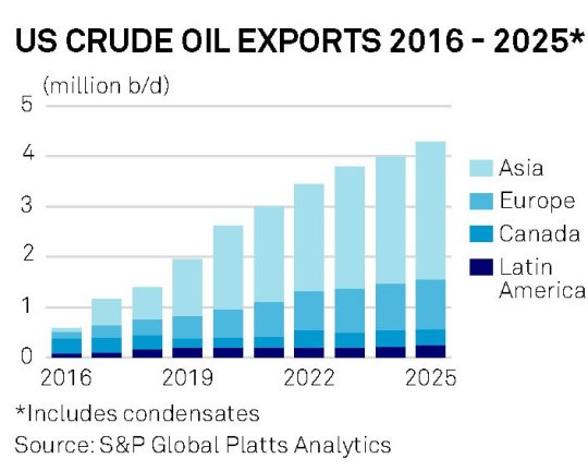 Secondo alcune stime recenti la Cina avrebbe superato gli 8,43 milioni di barili importati nel 2017, in crescita di 780 mila barili rispetto all’anno precedente, divenendo di fatto il driver della crescita della domanda globale di petrolio del prossimo decennio. Le stime illustrano che a fronte dei 13,55 milioni di barili complessivamente consumati in Cina a maggio scorso, 440 mila in più rispetto a un anno prima e 2,37 milioni in più rispetto a cinque anni fa, il consumo cinese di petrolio arriverà a superare i 14 milioni di barili entro fine 2019. A fronte di ciò la produzione Usa svolge lo stesso ruolo sul lato dell’offerta. Platts stima che la produzione globale di greggio passerà dagli attuali 95 milioni di barile al giorno (bpd) a 105 milioni nel 2025 e molto di questo aumento sarà petrolio Usa light crude estratto dai campi shale e in particolare dal bacino Permiano texano. Entro il 2025 gli Usa dovrebbero esportare 4 milioni di barili al giorno, 2,5 dei quali in Asia.