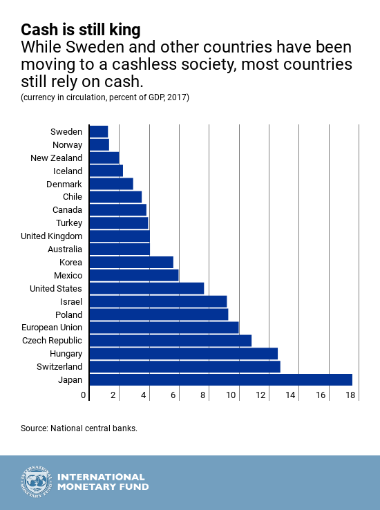 Come si può osservare da questo grafico, il cash è ancora molto diffuso in gran parte del mondo. Quindi serve un’idea diversa per rendere il contante costoso quanto i depositi bancari. A molti sembrerà un discorso astruso, ma la comunità scientifica ne discute da anni. E da qui è emersa la proposta al centro dello studio del Fmi: separare la moneta del paese in due valute diverse, una elettronica e una contanti. Una moneta digitale e una analogica che facciano ovviamente riferimento allo stesso conio ma che siano in rapporto fra loro attraverso un rapporto di conversione fissato dalla banca centrale. In tal modo un tasso negativo sulla valuta digitale si può trasferire su quella analogica.