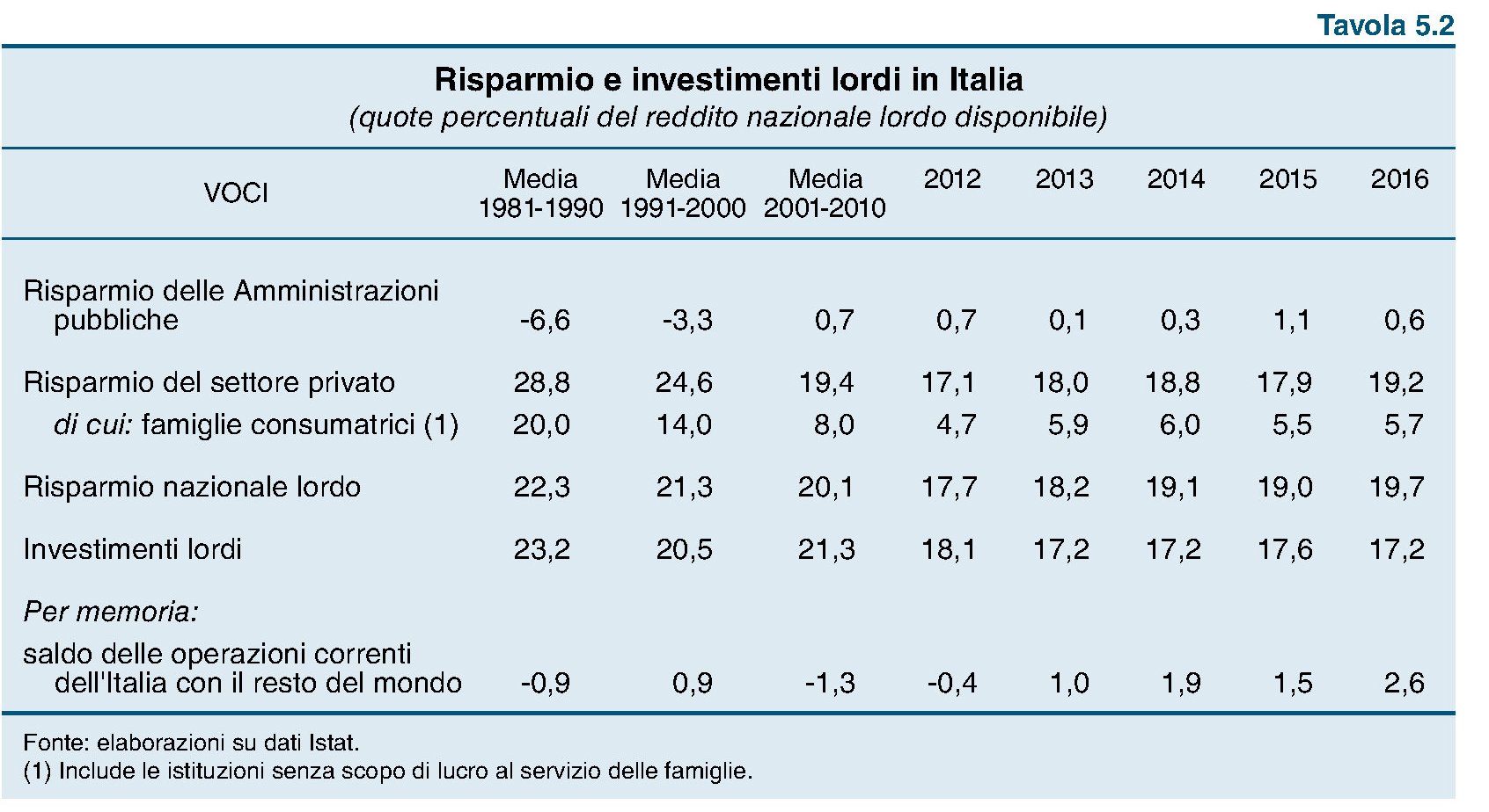 La cosa che salta all’occhio è che l’Italia ha ancora un livello molto basso di investimenti rispetto alla media storica. Ma soprattutto si nota il notevole dimagrimento della quota di risparmio nazionale delle famiglie sul totale del reddito nazionale lordo disponibile. Nel decennio degli anni ’80, quando il settore pubblico provocava in media deficit per il 6,6 del reddito nazionale lordo disponibile, le famiglie risparmiavano uno quota pari al 20% di questa grandezza. Nel 2016 siamo appena al 5,7%. Che fine ha fatto il risparmio delle famiglie italiane? Facile: una parte l’hanno guadagnato le imprese, che hanno visto crescere il risparmio dall’8,8% medio degli anni ’80 a oltre il 13%. Un’altra parte è sparita perché lo stato ha ridotto i suoi deficit, divenuti ormai un attivo. Dal 2000, infatti, il settore pubblico ha avuto una quota positiva, pure se variabile, di percentuale di risparmio sul totale del reddito. Le famiglie risparmiavano tanto perché lo stato spendeva tanto. Oggi non più.