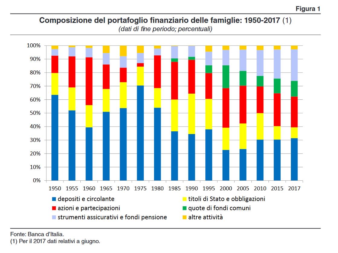 Si è verificata una massiccia fuga dai titoli di Stato, ma la quota immobilizzata nei conti correnti è quella che ha ancora il maggior peso relativo. Non siamo poi così tanto cambiati, se considerate quanto sia mutato il mondo dal 1950.