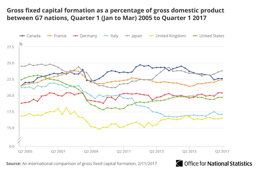 Le ultime dall’Uk. La BoE ha innalzato i tassi di sconto, portandoli dallo 0,25% allo 0,5%, per la prima volta in dieci anni. Un piccolo evento che ha scatenato le celebrazioni e le analisi e soprattutto i timori su ciò che succederà da questo momento in poi, anche se il governatore ha fatto capire che il rialzo sarà assai graduale e moderato. Tuttavia un paio di ricognizioni su alcuni dati possono aiutarci a farci un’idea del futuro britannico, specie una volta che i negoziati per la Brexit si concluderanno. Il primo riguarda gli investimenti. La politica monetaria facile non è servita a frenare il declino degli investimenti, che nel decennio sono cresciuti persino meno dei nostri, il che è tutto dire.