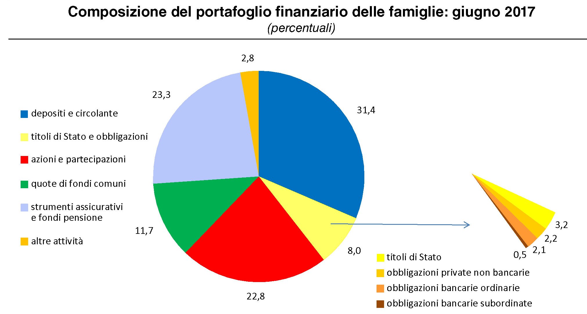 E’ curioso notare che nel 1960 le famiglie italiani abbiano raggiunto il picco di investimenti azionari sul totale degli asset, per poi declinare vistosamente. Forse, come disse anni dopo l’ex governatore Carli in conseguenza della nazionalizzazione del mercato dell’energia elettrica, che distrasse dai mercati molti risparmi, che magari furono dirottati nei titoli di stato, o forse per il diffondersi della ricchezza finanziaria. Fatto sta che quindici anni dopo, al picco del periodo inflazionistico, depositi e liquidità assorbivano il 70% del totale degli asset, più che negli anni ’50. E oggi? La situazione è questa: