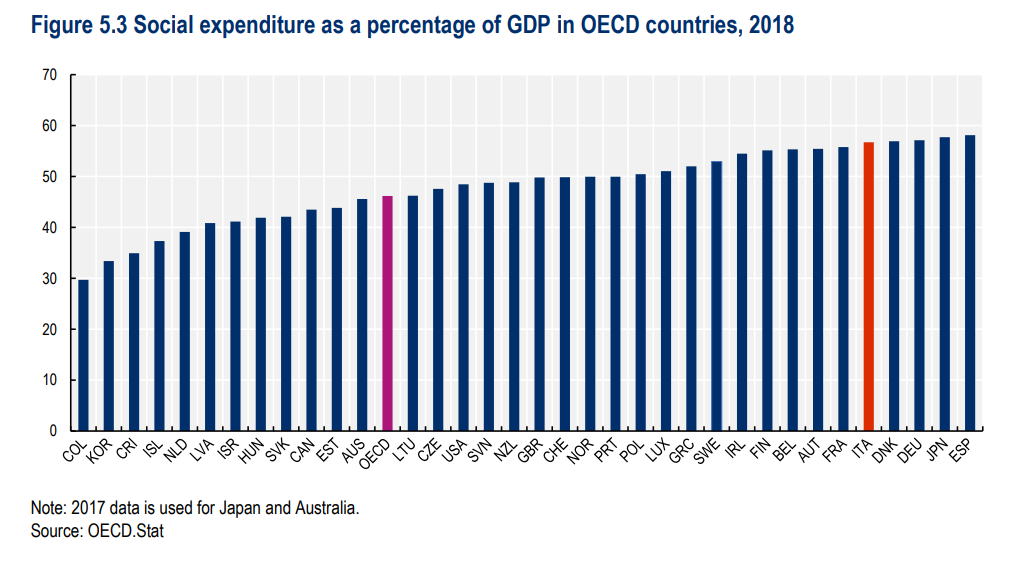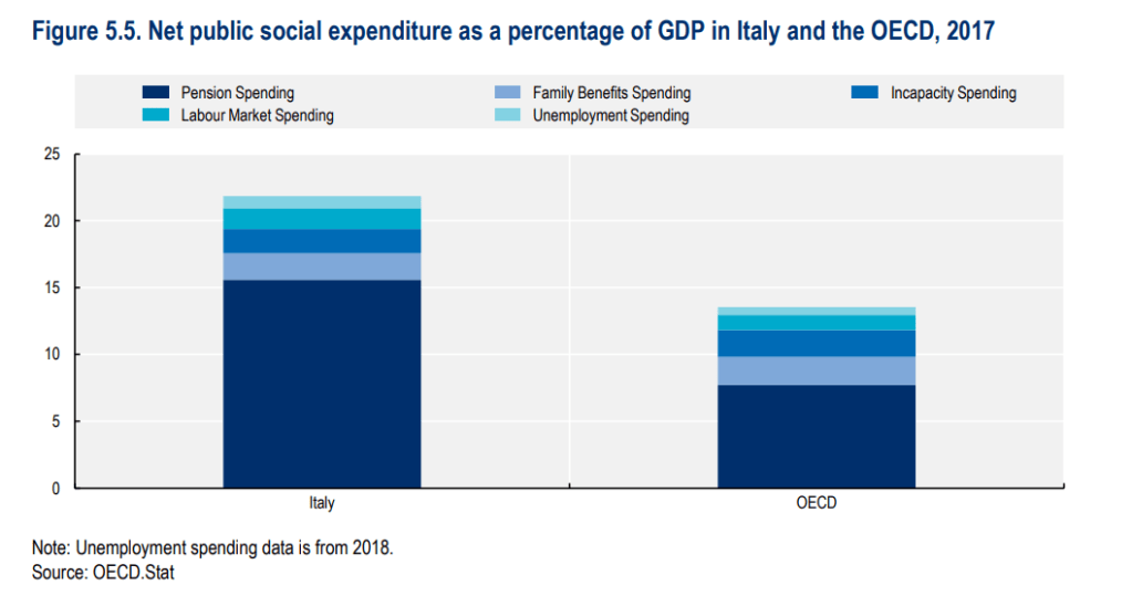 Ocse non sembra nutrire molti dubbi in proposito. La notevole spesa sociale che il nostro paese impegna ogni anno – siamo ai primi posti sul pil come si può vedere dal grafico sotto – infatti è dovuta proprio alla spesa pensionistica (grafico sopra).