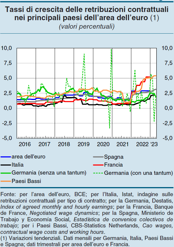 Si osserva che il salario minimo legale è aumentato parecchio anche in Germania e Spagna. Questo andamento, tuttavia, influenza solo parzialmente la contrattazione collettiva, incidendo soprattutto sulle retribuzione dei lavoratori a più basso reddito.