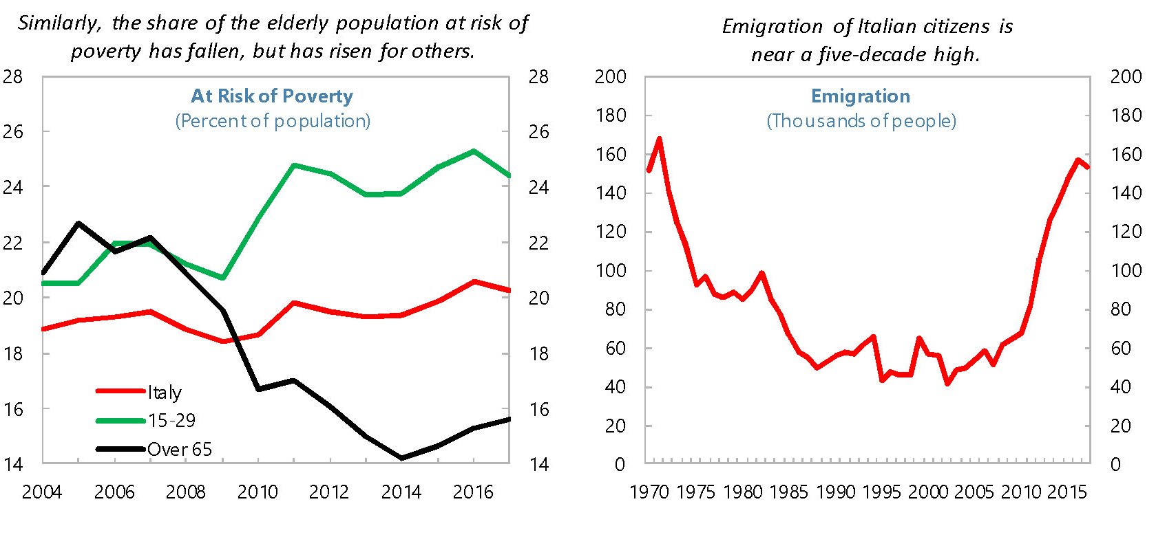 Il promemoria arriva dal Fmi, nell’ultimo staff report dedicato all’Italia, che ospita alcuni grafici che dovremmo tenere tutti a mente quando discorriamo del presente, proprio perché rappresentano bene il nostro passato. Un passato al quale sembrava ormai consegnata la nostra vocazione migratoria. E invece non è così.