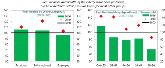 Dai grafici si evince con chiarezza che la diminuzione dei redditi reali, fatta come base l’anno 2000, è stata molto pronunciata per i più giovani che per gli anziani, e anche la suddivisione del reddito per categoria di percettori lo mostra con chiarezza. Tutti comunque soffrono di una condizione che è decisamente patologica per il paese: ossia il crollo dei redditi reali complessivi che sono anche un 5% sotto il livello del 2000. E che sia patologica, questa situazione lo si ricava dal confronto internazionale.