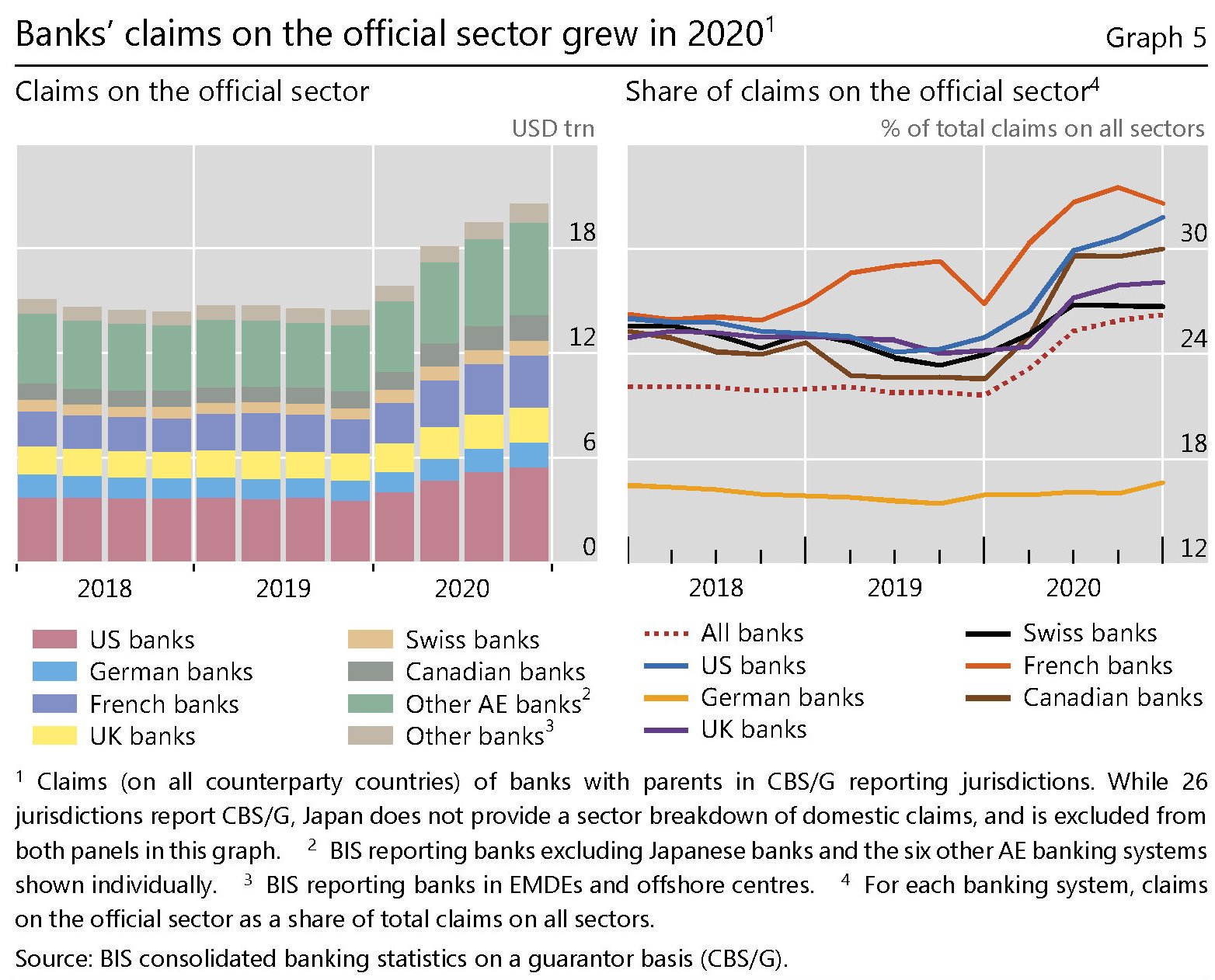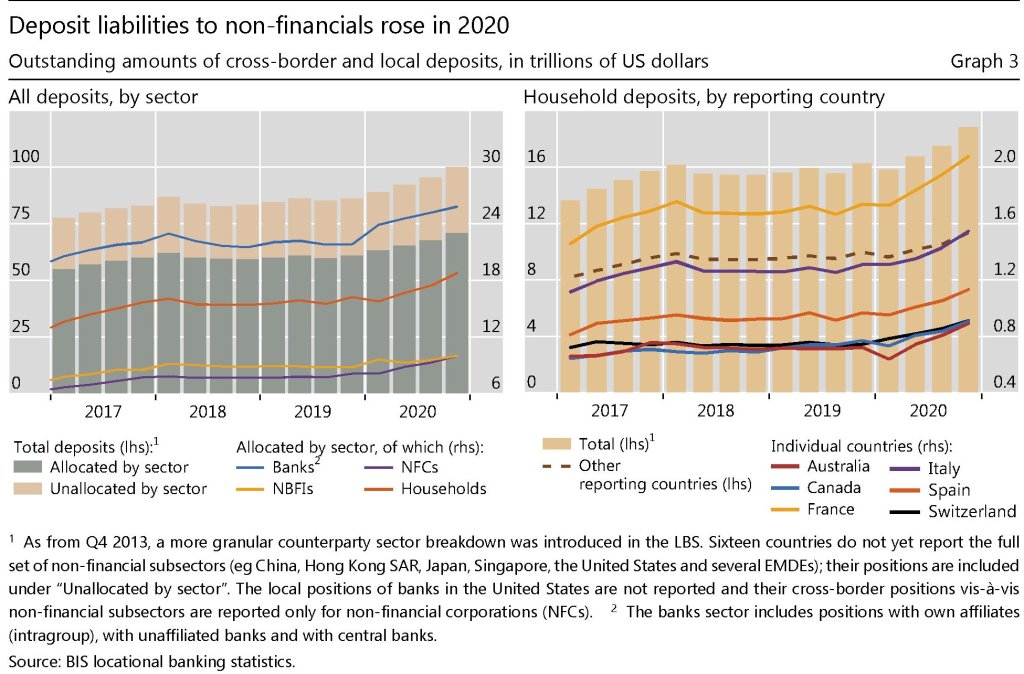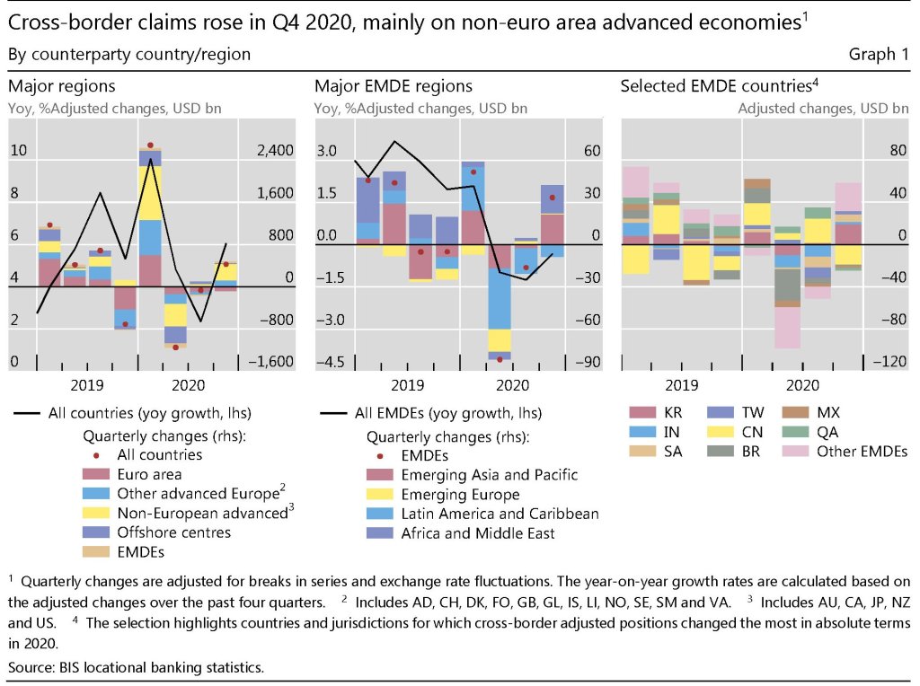 In ogni caso, lo stock complessivo di crediti ormai quota 35,6 trilioni. Buona parte di questi crediti, sempre nel quarto trimestre, sono stati presi a prestito da prenditori canadesi (+20% su base annua) e poi britannici (+13%) e statunitensi (+11%). Si segnala anche un certo shift fra i centri offshore, con le isole Cayman a perdere 60 miliardi e i centri asiatici di Hong Kong e Singapore guadagnarne rispettivamente 36 e 43.