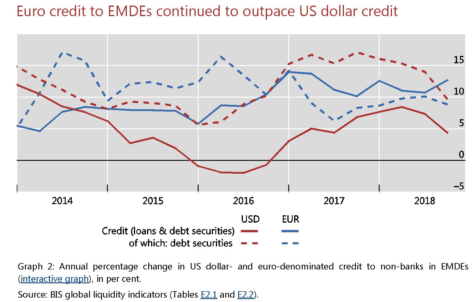 Si nota in particolare la crescita pronunciata sia dei prestiti bancari che del debito obbligazionario. Questi paesi si sono indebitati assai meno in dollari – l’emissione netta di debito obbligazionario è stata quasi a crescita zero nel terzo trimestre – e sempre più in euro. La crescita del 13% su base annuale è stata guidata dai prestiti bancari, cresciuti del 15% su base annua a settembre 2018.