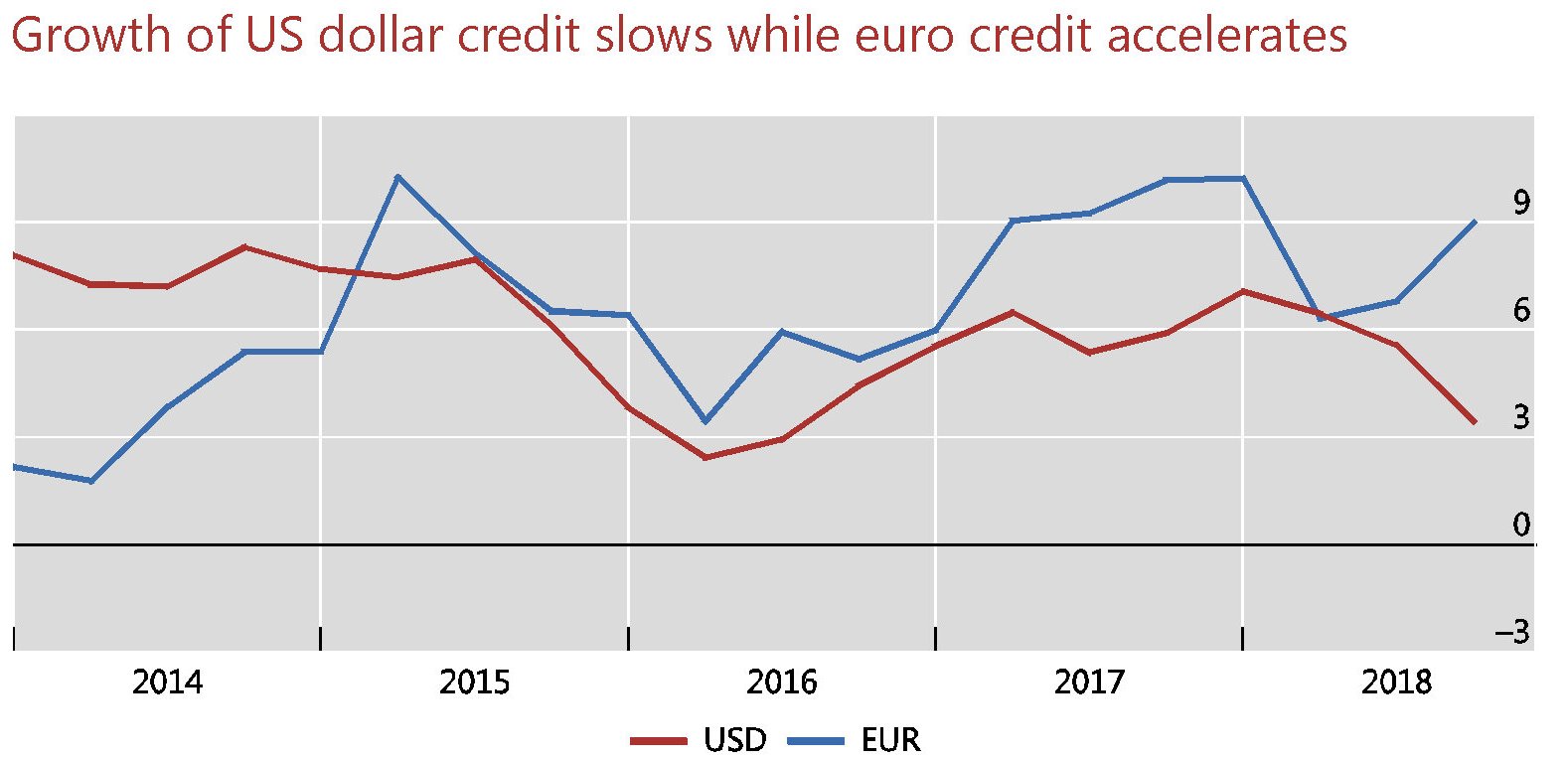 A livello aggregato il credito in dollari Usa ai prenditori non bancari, cresciuto del 3% nel terzo trimestre 2018 dopo aver toccato un picco del 7% a fine 2017, è arrivato a quota 11,5 trilioni. Quello in euro, cresciuto del 9% nel terzo trimestre 2018 su base annua è arrivato alla quota record di 3,7 trilioni di dollari (3,2 trilioni di euro).