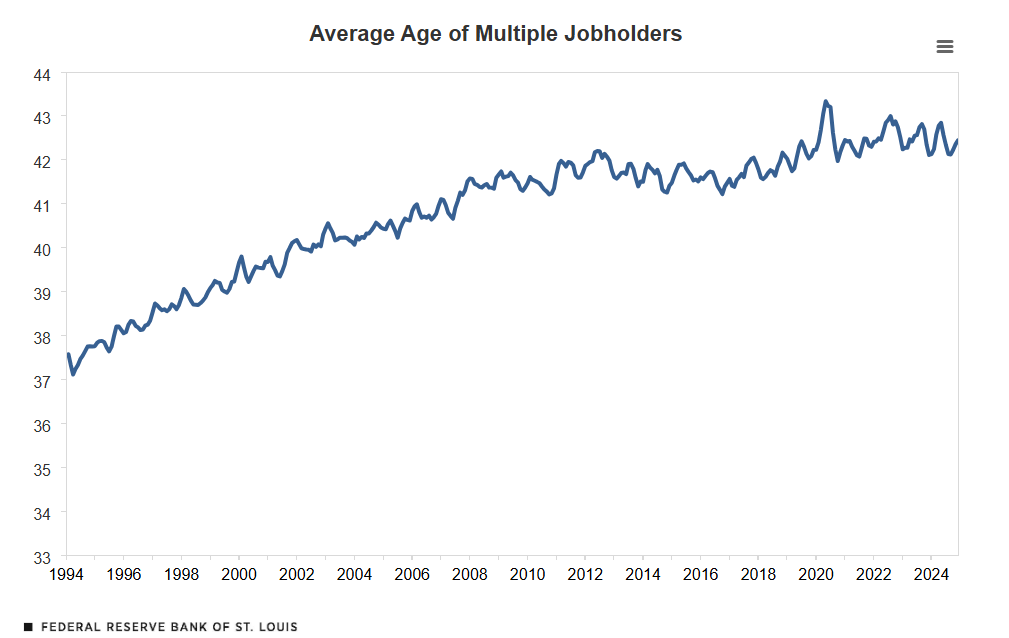 Questi “sovraoccupati” aggiungono in media altre 13,5 ore alle 35 settimanali che già svolgono. E il primo fatto interessante è che, mentre le extra ore rimangono costanti, l’età di questi hard worker cresce nel tempo.