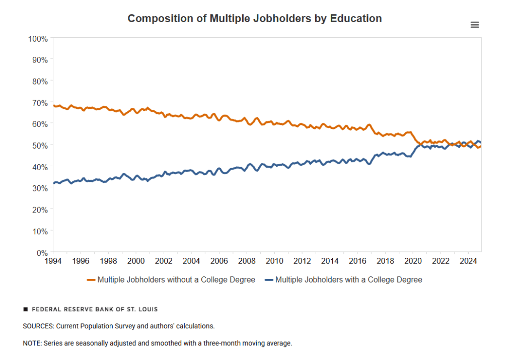 La seconda evidenza interessante è che cambiato anche il profilo formativo di questi soggetti. Storicamente il secondo lavoro era associato alle persone meno istruite, che invece hanno finito con l’essere sempre meno, mentre crescevano i doppi lavori (o le extra ore) di quelle più istruite. Al punto che orami sono di più queste ultime.