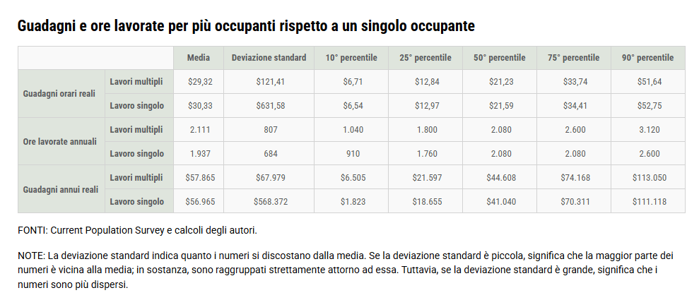Le analisi delle retribuzioni svolte dai tecnici mostrano che “chi ha solo un lavoro percepisce guadagni orari più elevati, ma svolge un numero inferiore di ore rispetto a chi ha più di un lavoro. E malgrado lavorino parecchie ore di meno, percepiscono una retribuzione solo di poco inferiore.