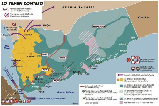 La cartina sopra pubblicata da Limes è una buona sintesi della situazione. I grandi assenti da questa contesa, Europa e Cina, contribuiscono anche loro, ognuno a suo modo. In Europa i singoli paesi vendono armi ai paesi coinvolti nel conflitto mentre l’Ue invita alla pace. I cinesi esortano anch’essi alla composizione diplomatica del conflitto, ma sicuramente guardano con grande attenzione all’imbocco del Golfo, dove passa anche molto del “loro” petrolio. Peraltro fra le due aree esiste una collaborazione di vecchia data che Pechino, già ben posizionata a Gibuti, non può che voler riattivare.