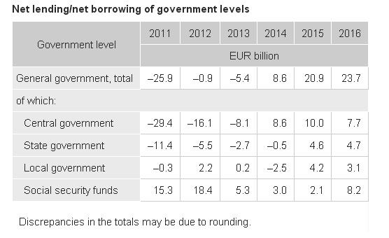 Gli “utili” del governo tedesco Potremmo chiamarlo il miracolo della crescita nel suo avverarsi. Perché è innanzitutto la crescita del prodotto, e quindi delle tasse pagate, compresi i contributi sociali, a rendere possibile che il bilancio del settore pubblico tedesco sia in attivo per il terzo anno consecutivo, per un importo che sfiora i 24 miliardi di dollari, lo 0,8% del pil, al livello degli utili di JP Morgan nel 2015. Merito della crescita, perciò, ma anche della buona amministrazione della cosa pubblica. I tedeschi stanno lentamente avvicinandosi all’obbiettivo che avevano annunciato diverso tempo fa: portare il debito pubblico al 60% del Pil. E l’unico modo per riuscire è facendo in modo che gli incassi fiscali superino le spese. Qualcuno dirà che l’avanzo di bilancio pubblico, che di fatto sottrae risorse alla collettività senza restituirle è una forma di austerità. E, da un punto di vista contabile, potrebbe pure avere ragione. Rimane il fatto che nel 2016, anno in cui il surplus ha battuto ogni record dai tempi della riunificazione, si è connotato per una robusta spesa del governo. Hanno risparmiato di più spendendo insieme di più. E questo è un altro miracolo tedesco.