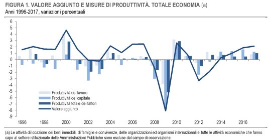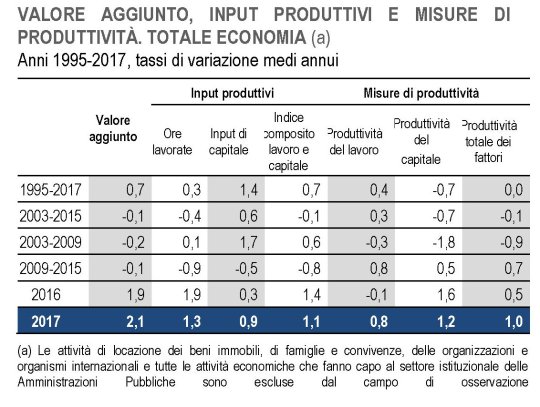 Cominciamo dalle definizioni. La produttività totale dei fattori, spiega Istat, “misura gli effetti del progresso tecnico e di altri fattori propulsivi della crescita, tra cui le innovazioni nel processo produttivo, i miglioramenti nell’organizzazione del lavoro e delle tecniche manageriali, i miglioramenti nell’esperienza e nel livello di istruzione raggiunto dalla forza lavoro”. Si tratta quindi di un indicatore che si propone di fotografare sostanzialmente l’efficienza di un sistema produttivo e che concorre insieme alla produttività del lavoro e a quella del capitale alla dinamica della crescita di un’economia e quindi al valore del suo prodotto finale. Gli indici di produttività di lavoro e capitale sono degli indicatori che raffrontano il valore aggiunto (VA) con gli input di lavoro (il monte ore lavorate) e di capitale (flusso servizi produttivi fornito dallo stock delle diverse tipologie di capitale). E’ opportuno ricordare che le misure di produttività proposte da Istat non comprendono, fra le altre cose, “tutte le attività economiche appartenenti al settore istituzionale delle Amministrazioni Pubbliche”. Quindi si fa riferimento sostanzialmente al settore privato.