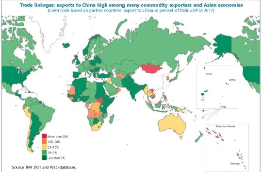 Oggi la Cina sembra si stia preparando alla sua prossima avventura imperiale, stavolta su scala globale, e lo sta facendo con grande pazienza, ricostruendo antiche relazioni (Asia centrale e Medio Oriente) e tessendone di nuove (Africa). Anche qui ci viene in aiuto il Fmi che nel suo ultimo staff report illustra con due grafici molto istruttivi il livello di penetrazione dell’economia cinese nel mondo.